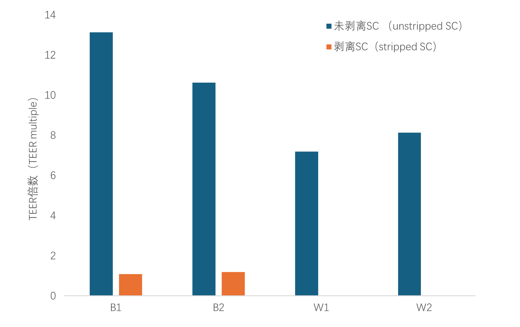 对剥离SC 的皮肤进行了TEWL、电阻及利斯的明透皮贴剂AMT 的测量,验证了SC 影响AMT;剥离和未剥离SC 皮肤的TEWL、TEER 倍数值变化显著;确定了可以通过TEWL、TEER 倍数对皮肤完整性进行评估,以利斯的明为例,初步看来TEER倍数对于皮肤屏障的完整性变化更加敏感。