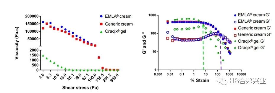 图4.左图:利多卡因/丙胺卡因乳膏和凝胶产品的粘性随剪切应力的变化。右图:对所有三种产品进行应变扫描。闭合符号(G’)表示存储模量,开放符号(G”)表示损耗模量。凝胶的屈服应力为110,Oraqix®凝胶的屈服应力为11。
