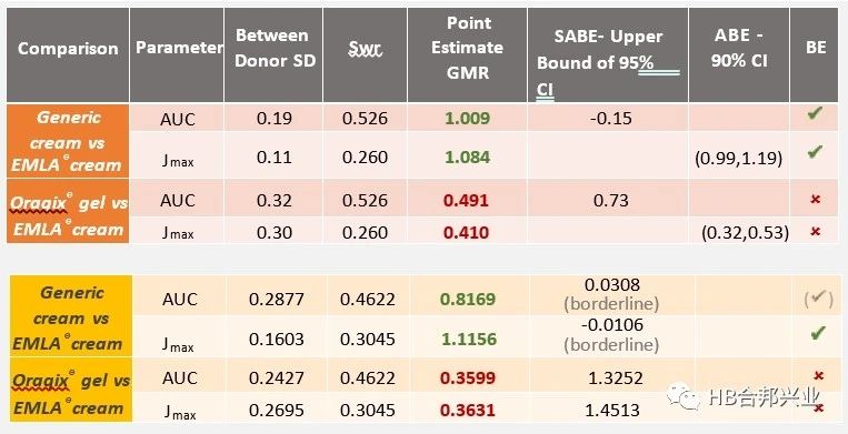 表1.利多卡因BE分析结果(橙色);基于曲线下面积(AUC)和最大通量(Jmax)的PK终点以及与EMLA®乳膏(Swr)相关的供体变异性,丙胺卡因(黄色)