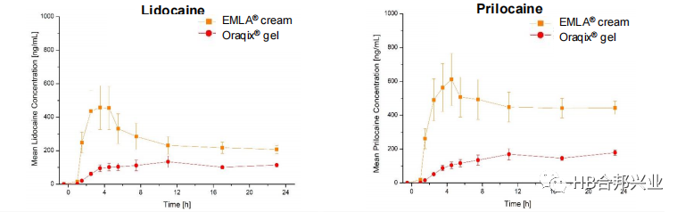 图6.EMLA®乳膏和Oraqix®凝胶在给药10mg /cm2产品后的平均利多卡因/丙胺卡因浓度-时间曲线(±SE)。数据以6名受试者的平均值±SEM表示。