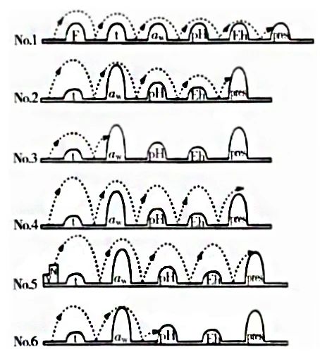 栅栏技术应用于食品保存的6个案例[23](图2)可帮助理解aw对于微生物生长的重要意义。栅栏因子的组合将增加不利于食品中潜在微生物的生长,并增加微生物生长的滞后期,如果微生物的生存环境持续抑制其生长繁殖,滞后期无限延长,将致使微生物死亡[24]。